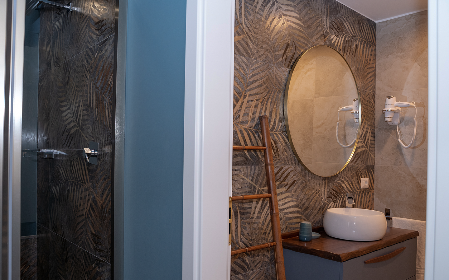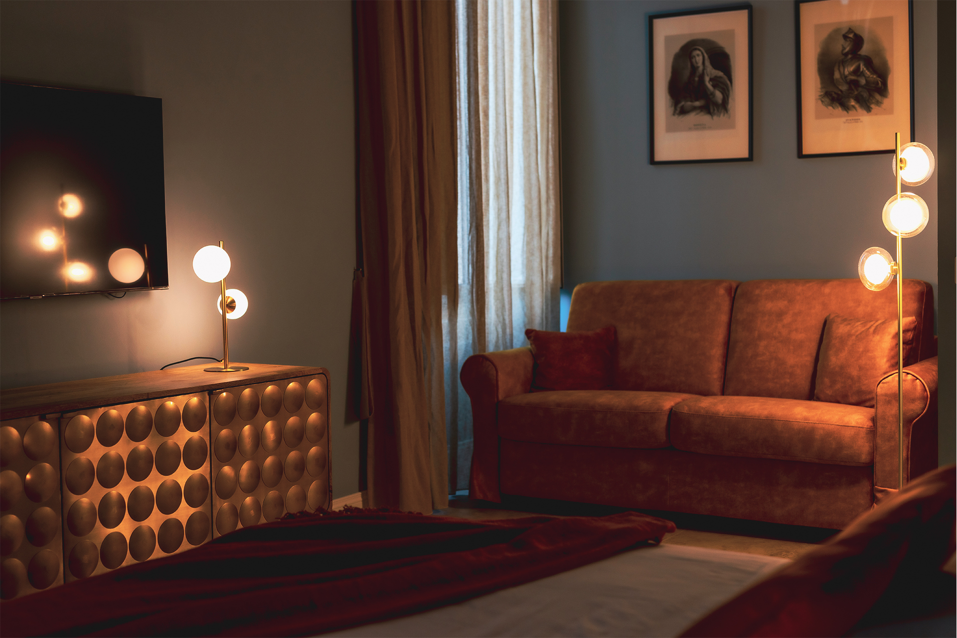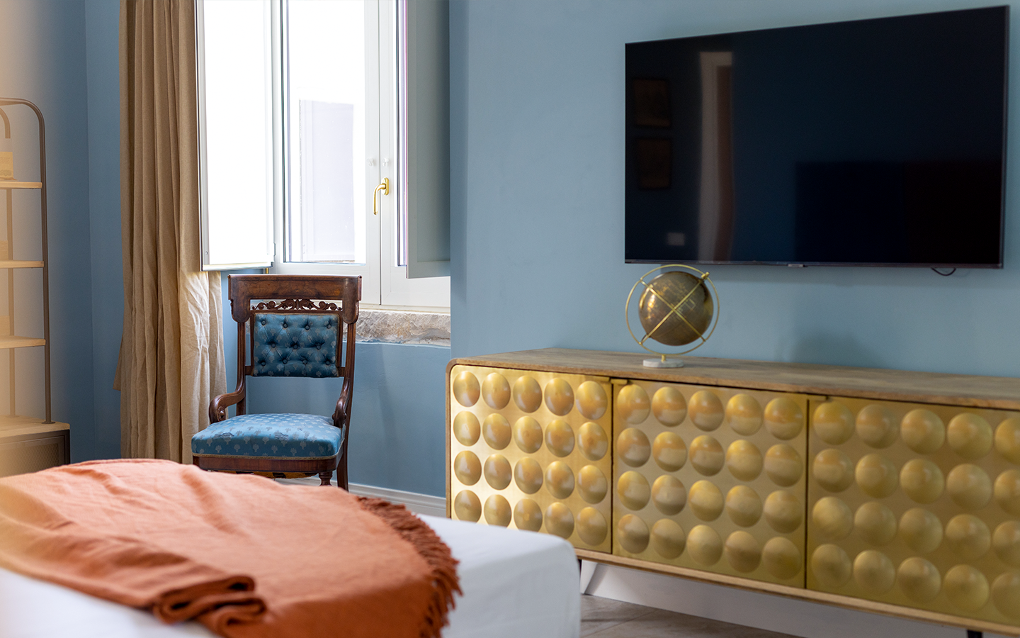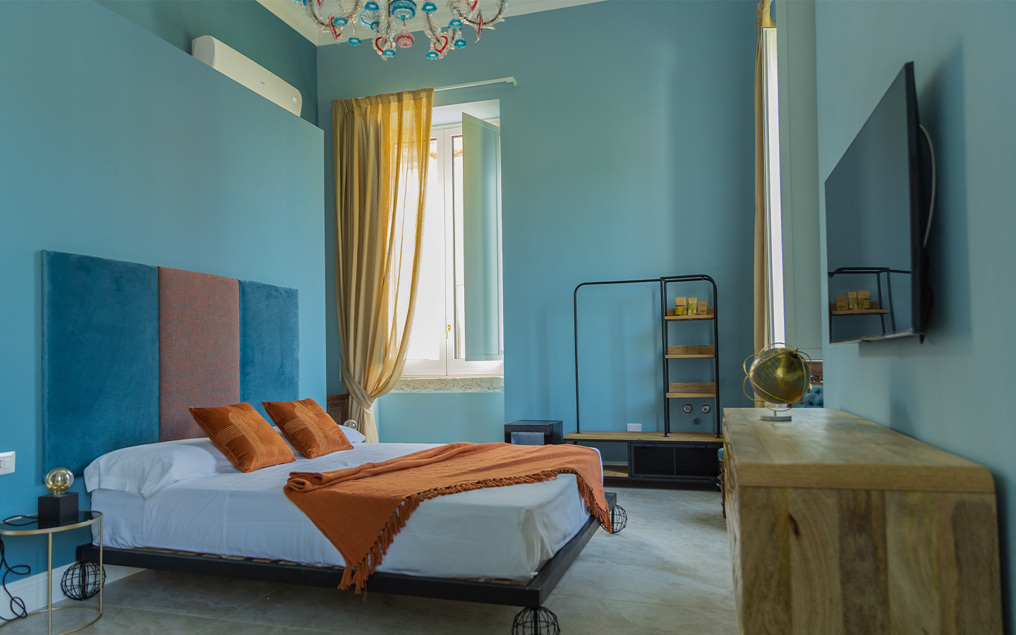 Un colore fresco nelle tonalità del ceruleo domina in questa stanza nella quale è collocato un letto di design in ferro battuto con sfere che rimandano ai paralleli e ai meridiani , sormontato da un lampadario Ca’ Rezzonico in vetro di murano. In ogni stanza è presente un frigobar a disposizione dei clienti.